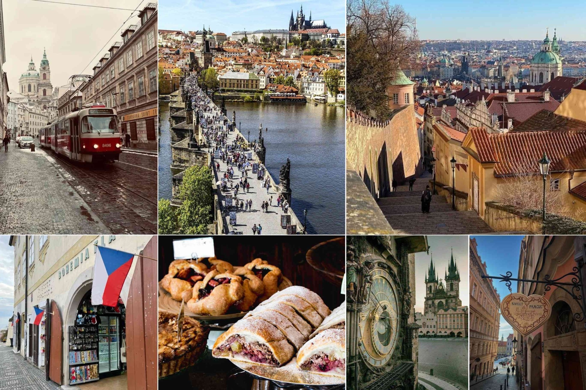 Key Spots Around Prague The photos show well-known areas in Prague. The red tram runs through Malá Strana which is one of the oldest districts in the city. The large bridge filled with people is the Charles Bridge that connects Malá Strana with the Old Town. The staircase with the city view is located near Prague Castle on the way down to Nerudova Street. The shop with Czech flags is typical for the Old Town area where souvenirs and local items are sold. The pastries are common Czech bakery products such as koláče and strudel which you find in local cafes and bakeries across the city. The astronomical clock is the famous Prague Orloj located on the Old Town Square. The street with the heart-shaped sign is also part of Old Town Prague where many narrow lanes connect small shops and cafes. All these places are within walking distance which makes Prague easy to explore in one or two days. #VisitCzechia #Prague #CzechTravel #CharlesBridge #PragueCastle #OldTownPrague #AstronomicalClock #CityBreakEurope #TravelEurope