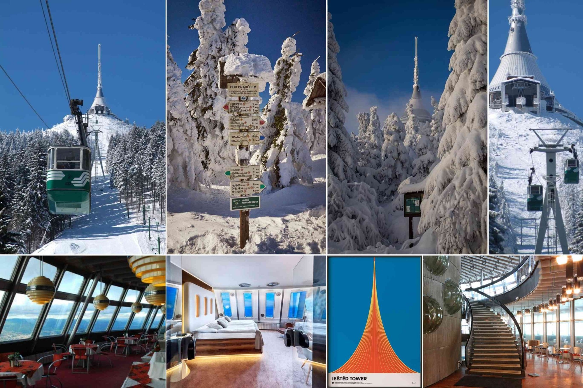 Ještěd Mountain and the Ještěd Tower These photos show Ještěd Mountain near Liberec which is known for its cable car the ski slopes and the iconic Ještěd Tower. The cable car runs from Horní Hanychov to the top of the mountain and is one of the main ways to reach the tower. The snowy signposts belong to the marked trails around Ještěd which are used for winter hiking and cross-country skiing. The tower itself functions as a hotel and restaurant. The interior photos show the restaurant with panoramic windows and one of the retro-style hotel rooms that kept the original design from the 1970s. The poster image represents the unique architecture of Ještěd which is a symbol of the Liberec region. The staircase area is part of the tower’s public space where visitors can enjoy the views in every direction. Ještěd is easy to visit from Liberec and is a good option for a day trip with clear access by cable car or hiking routes. #VisitCzechia #Jested #Liberec #CzechRepublic #MountainViews #CzechTravel #ArchitectureCzechia #WinterTravel #TravelEurope