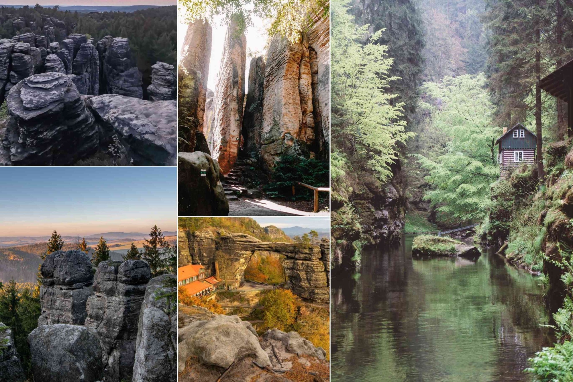 Bohemian Switzerland and Rock Formations in the North These photos show landscapes from Bohemian Switzerland National Park and nearby rock formations in the Bohemian Paradise (Český ráj) region. The tall sandstone towers in the upper-left images are typical for Prachov Rocks and Hruboskalsko which are popular for hiking routes with marked viewpoints. The narrow rock corridor with sunlight is located in Adršpach-Teplice Rocks which is known for its steep stone walls and loop trails. The large stone arch is the Pravčická Gate, the biggest sandstone arch in Europe located in Bohemian Switzerland near Hřensko. The river scene with the wooden cabin is from the Kamenice Gorge where visitors can walk along the river or take a short boat ride operated by local guides. These areas are accessible by marked trails and are some of the most visited nature spots in northern Czechia. #VisitCzechia #BohemianSwitzerland #Adrspach #PravcickaGate #CeskyRaj #CzechNature #HikingCzechia #TravelEurope